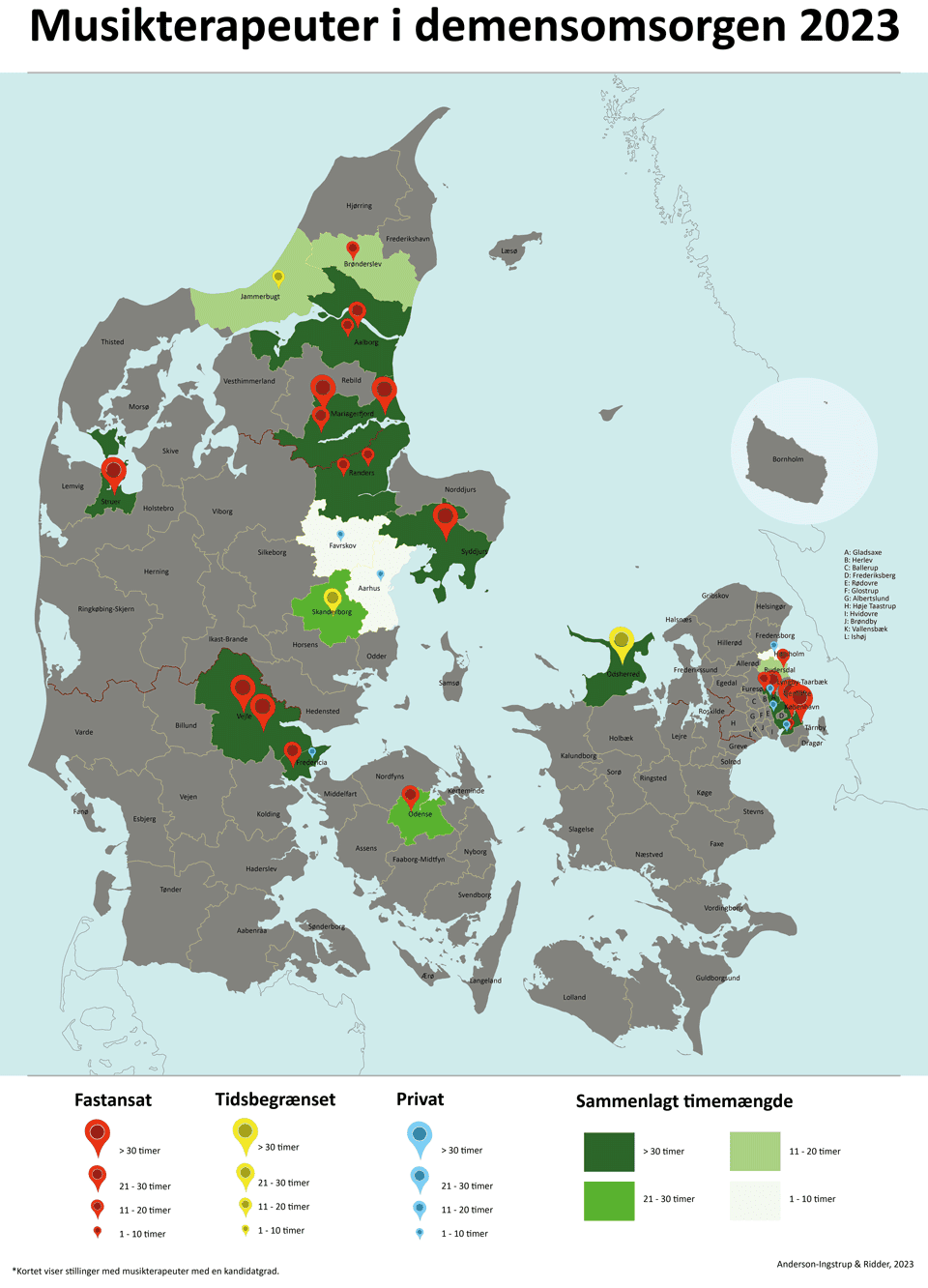 Danmarkskortet viser kommuner med en fastansat musikterapeut og afspejler med den grønne farvekodning i hvor stort omfang den enkelte kommune udbyder musikterapi.